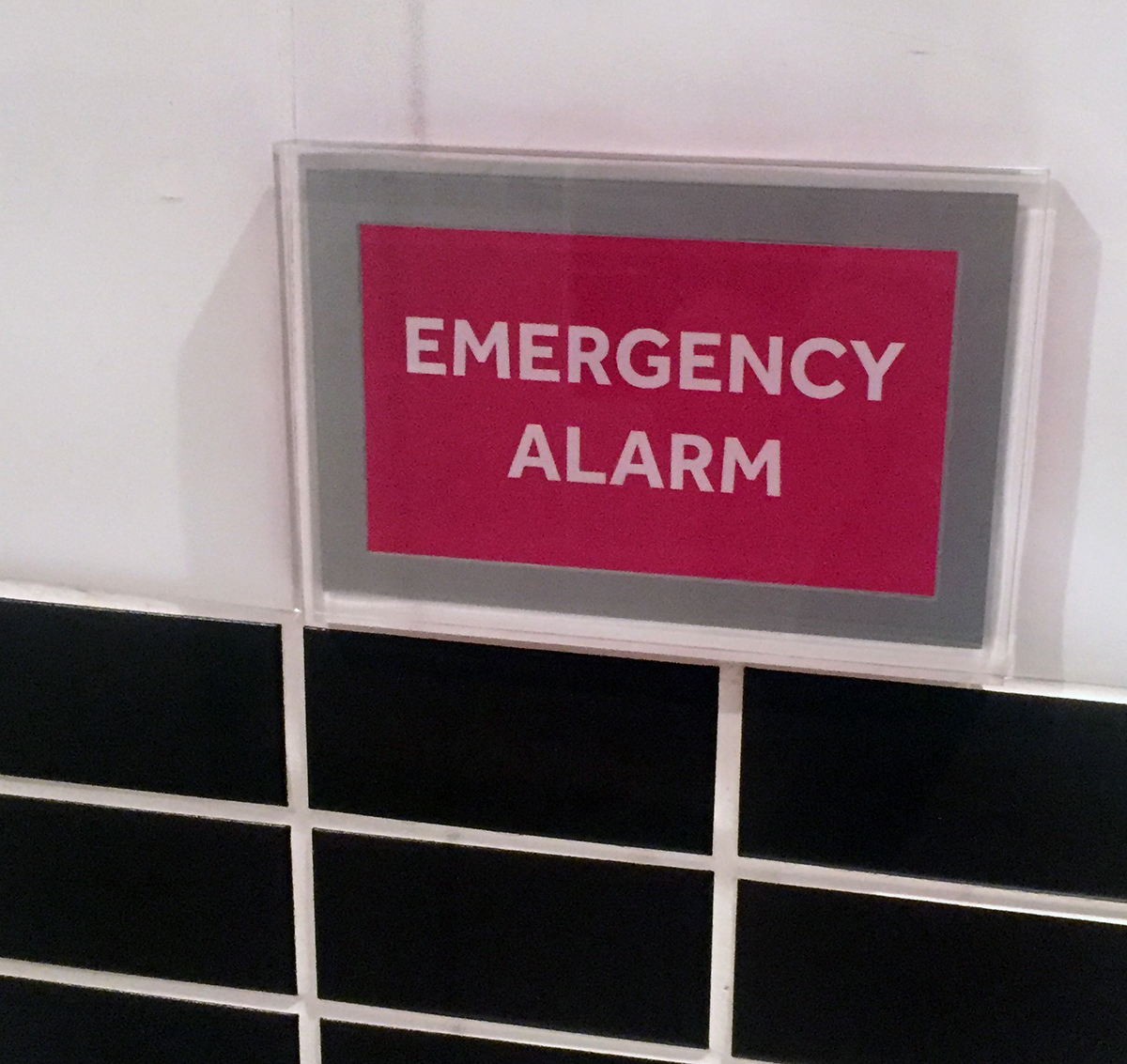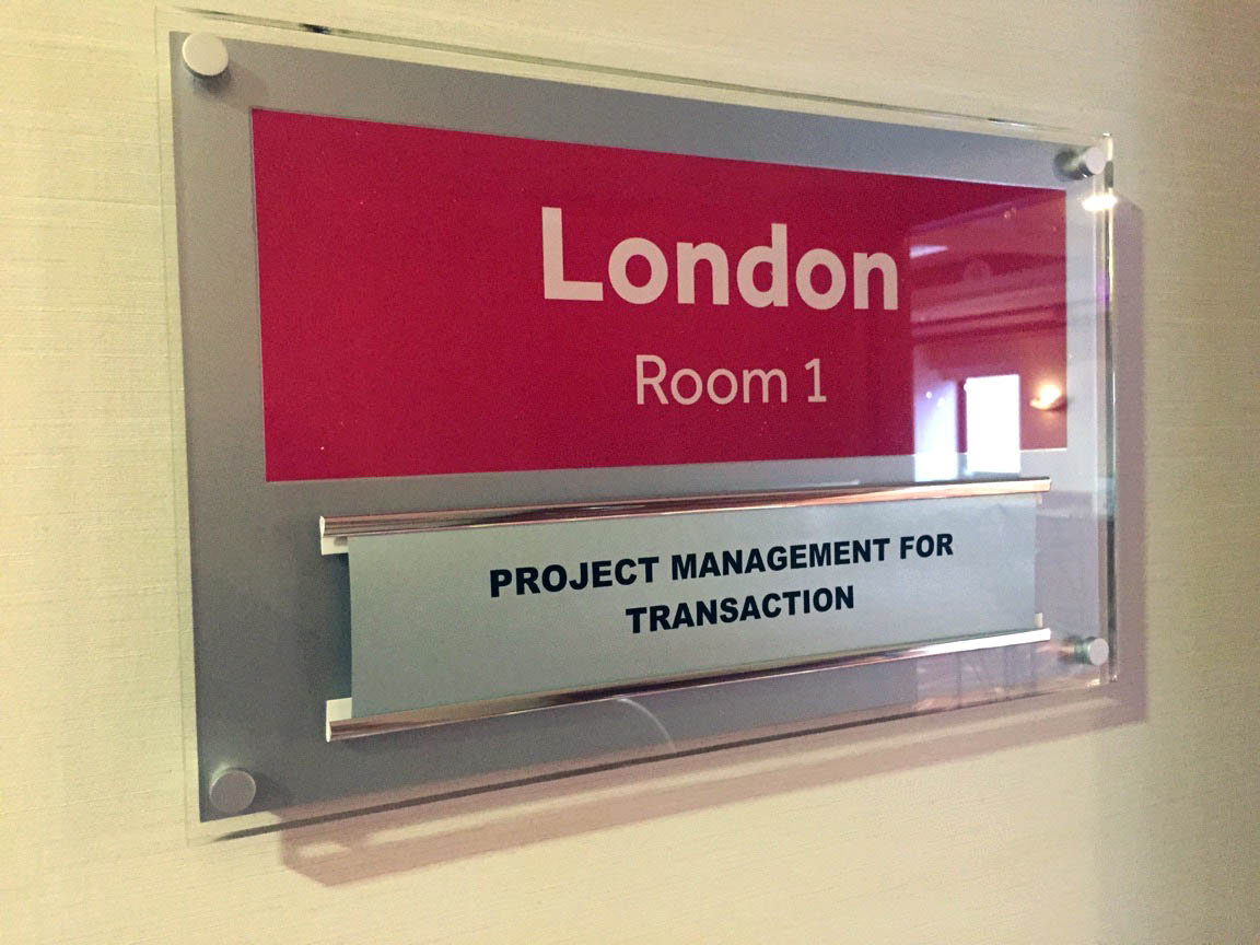 Various clear acrylic signs, some on stand off locators and some bonded straight to surface. Backed in metallic silver with reverse red print.